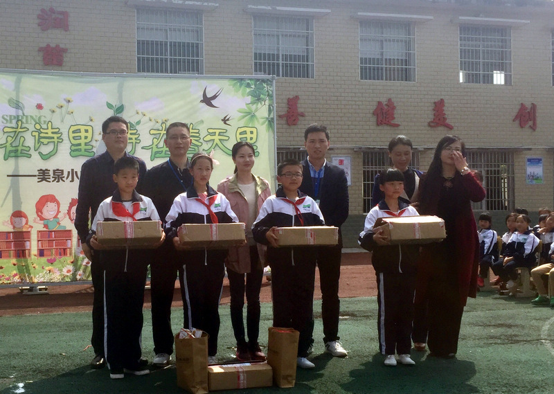 4月13日,集团第一支部一行3人参加了美泉小学举办2017年“春天在诗里,诗在春天”读书节活动启动仪式,并捐赠40余本书籍以及40套水写毛笔字帖。